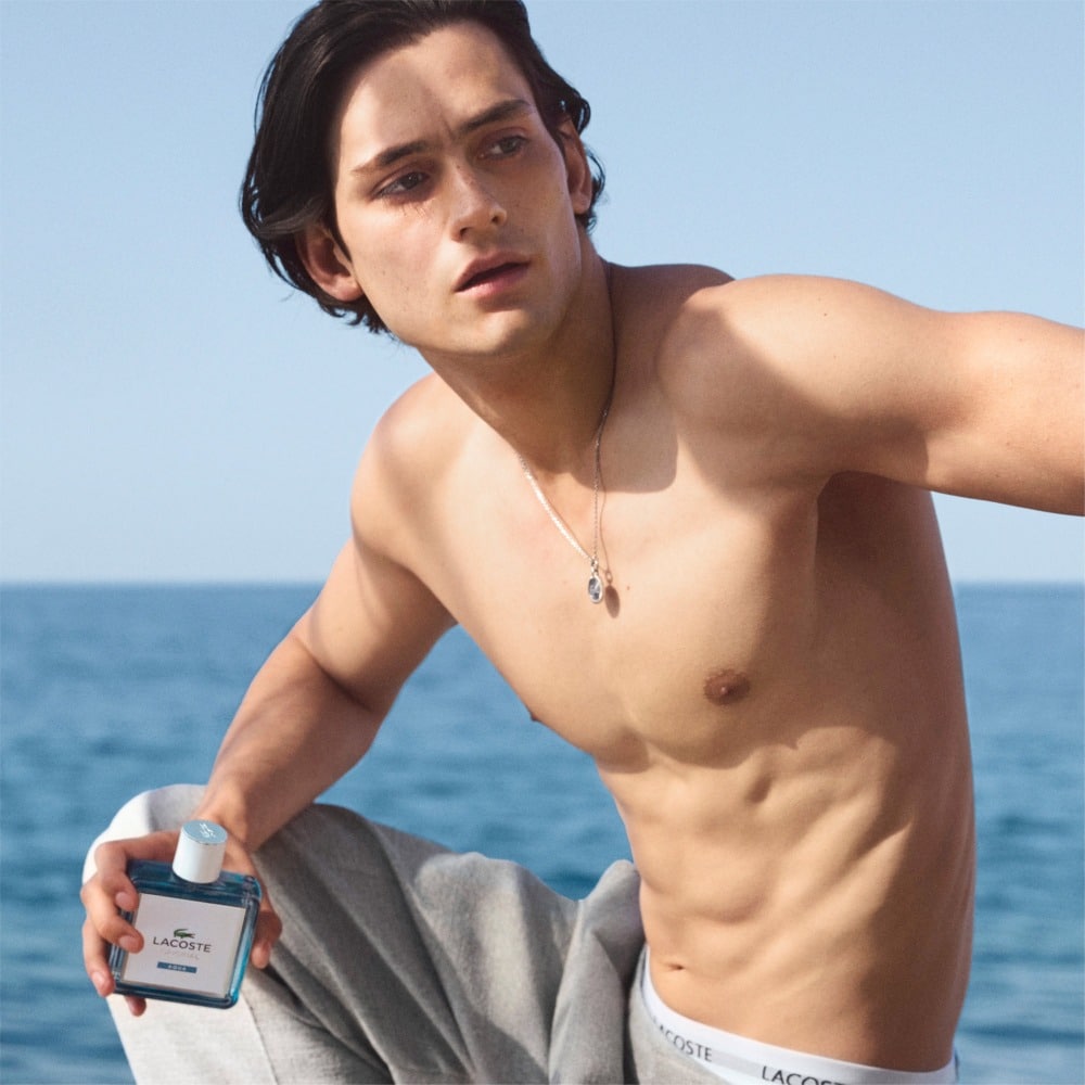 The bottle design reflects Lacoste’s signature blend of sport and sophistication. Crafted in sleek transparent glass, the flacon showcases the cool aqua-toned fragrance within, echoing the refreshing Mediterranean inspiration of the scent. Its clean lines and minimalist rectangular shape are complemented by refined metallic accents and the iconic Lacoste crocodile emblem, creating a design that feels modern, elegant and instantly recognisable. The colour palette of cool aquatic blues and clear glass reinforces the fragrance’s theme of freshness and freedom.